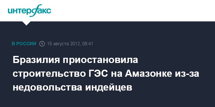 Лондон. 15 августа. INTERFAX.RU - Федеральный суд Бразилии постановил приостановить сооружение гигантской гидроэлектростанции в бассейне реки Амазонки: по мнению суда, строители не проконсультировались должным образом с местным индейским населением.