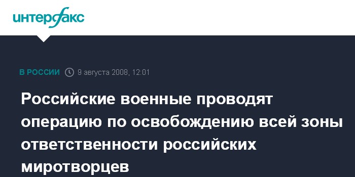 Москва. 9 августа. INTERFAX.RU - Российские войска проводят спецоперацию по освобождению всей зоны ответственности российских миротворцев в Южной Осетии, сообщил представитель командования.