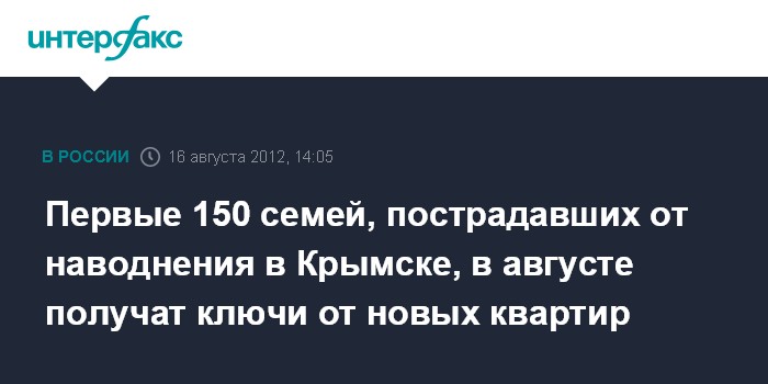 Краснодар. 16 августа. INTERFAX.RU - Первые 150 семей, чьи дома были разрушены во время наводнения в Крымске, получат ключи от новых квартир 21 августа, сообщается на официальном сайте губернатора Краснодарского края Александра Ткачева.