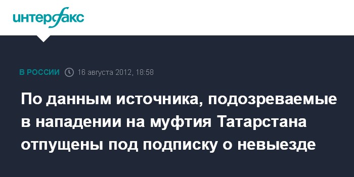 По данным источника, подозреваемые в нападении на муфтия Татарстана отпущены под подписку о невыезде