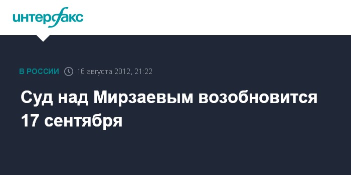 Москва. 16 августа. INTERFAX.RU - Процесс по делу чемпиона мира по боевому самбо Расула Мирзаева, после удара которого погиб 19-летний студент Иван Агафонов, продолжится 17 сентября.