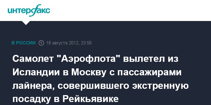 Москва. 16 августа. INTERFAX.RU - Пассажиры совершившего экстренную посадку в столице Исландии Рейкьявике самолета авиакомпании "Аэрофлот" вылетели в Москву, сообщил "Интерфаксу" официальный представитель авиакомпании. "Самолет с пассажирами взял курс на Москву", - сказал он.
