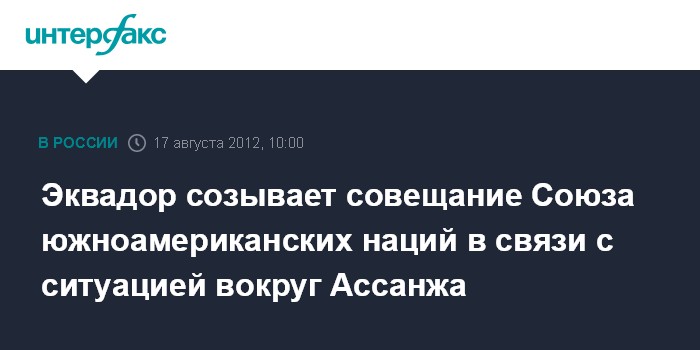 Бразилиа. 17 августа. INTERFAX.RU - Власти Эквадора решили организовать внеочередную встречу на министерском уровне стран-членов Союза южноамериканских наций (УНАСУР), чтобы обсудить последствия предоставления политического убежища основателю WikiLeaks Джулиану Ассанджу, сообщили в пятницу в министерстве иностранных дел Бразилии.