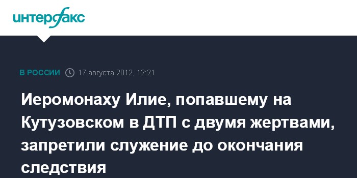 Москва. 17 августа. INTERFAX.RU - Русская православная церковь ожидает официальных результатов расследования обстоятельств ДТП на Кутузовском проспекте, произошедшего в ночь на 16 августа, участником которого, предположительно, стал иеромонах Илия (Семин), сообщили корреспонденту "Интерфакс-Религия" в пятницу в синодальном Информационном отделе.