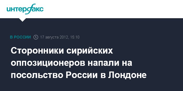 Москва. 17 августа. INTERFAX.RU - Посольство России в Великобритании подверглось нападению группы лиц, поддерживающих сирийскую оппозицию.