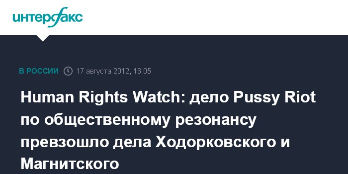 Как заявила "Интерфаксу" заместитель руководителя московского бюро организации Татьяна Локшина, никогда еще ранее не было такой общественной кампании и такого общественного резонанса, как по делу Pussy Riot. Ни дело Ходорковского, ни дело Магнитского такого общественного резонанса не вызывали, добавила она.