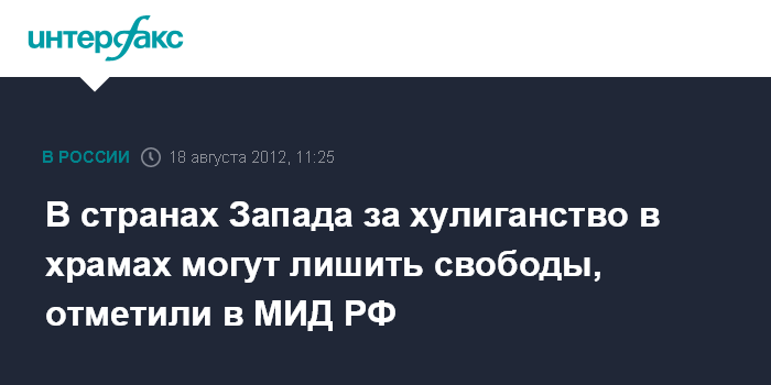 Москва. 18 августа. INTERFAX.RU - В странах Запада, в частности, в Германии и Австрии оскорбление нравственных чувств верующих граждан может караться лишением свободы, заявляет официальный представитель МИД РФ Александр Лукашевич. "В Уголовном кодексе ФРГ "деликты, совершаемые против религии и воззрения" (в частности, §§166 и 167), включая хулиганские выходки в пределах молельных помещений, караются лишением свободы сроком до трех лет или денежным штрафом", - сказал А.Лукашевич, отвечая в субботу на вопросы журналистов.