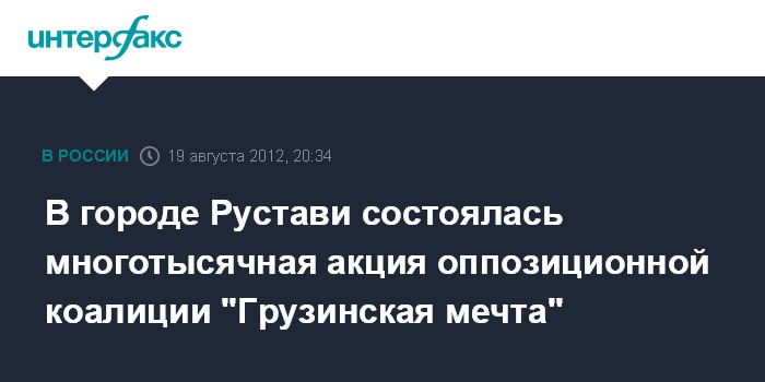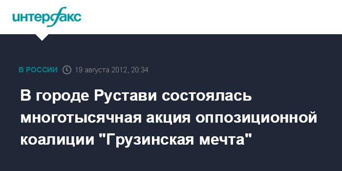 Тбилиси. 19 августа. INTERFAX.RU - Около 20 тысяч человек приняли участие в митинге сторонников оппозиционной коалиции "Грузинская мечта" на площади Шартава в грузинском Рустави в воскресенье, сообщили "Интерфаксу" организаторы акции.
