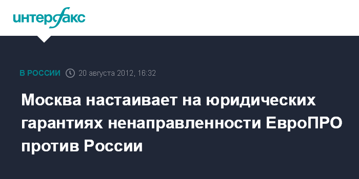 Хельсинки. 20 августа. INTERFAX.RU - Москва по-прежнему настаивает на получении твердых юридических гарантий того, что система ПРО США и НАТО, разворачиваемая в Европе, не направлена против России, заявил глава МИД РФ Сергей Лавров.