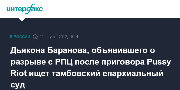 Тамбов. 20 августа. INTERFAX.RU - Епархиальный суд Тамбовской епархии разыскивает заштатного клирика диакона Сергия Баранова, объявившего о разрыве с РПЦ из-за дела Pussy Riot для дачи объяснений, сообщил в понедельник сайт епархиального управления.