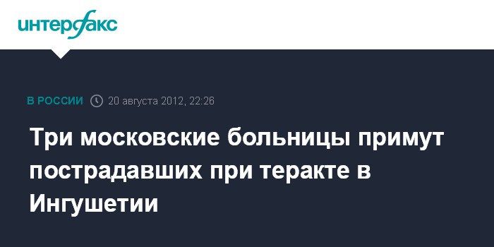 Москва. 20 августа. INTERFAX.RU - Пострадавшие от терактов в Ингушетии, доставленные в Москву спецбортом МЧС, будут определены в три московские больницы, сообщили в пресс-службе Минздрава России.
