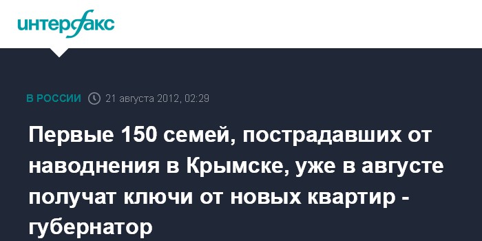 Краснодар. 21 августа. ИНТЕРФАКС-ЮГ - Первые 150 семей, чьи дома были разрушены во время наводнения в Крымске, получат ключи от новых квартир 21 августа, сообщается на официальном сайте губернатора Краснодарского края Александра Ткачева.