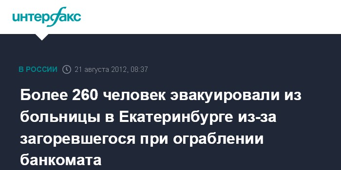 Екатеринбург. 21 августа. INTERFAX.RU - В Екатеринбурге в ночь на вторник из-за возгорания банкомата в главном корпусе Центральной городской больницы N20 были эвакуированы более 260 человек, сообщает пресс-служба ГУ МЧС по Свердловской области. При этом 7 человек эвакуировали на каталках и инвалидных креслах. Погибших и пострадавших нет.