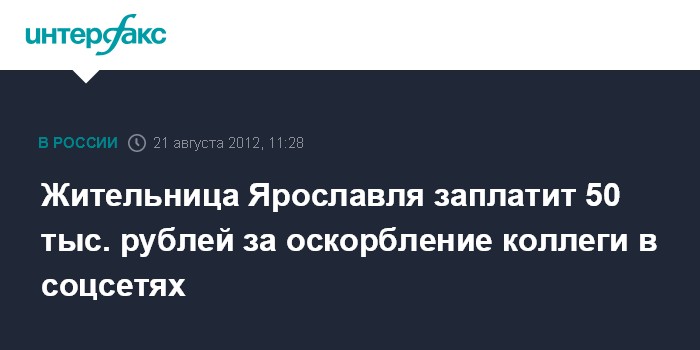 Ярославль. 21 августа. INTERFAX.RU - Судебные приставы взыскали с жительницы Ярославля 50 тыс. рублей в качестве компенсации морального вреда, причиненного оскорбительным высказыванием в адрес пользователя одной из социальных сетей, сообщает во вторник УФССП России по Ярославской области.