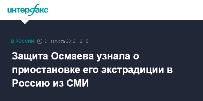 Одесса. 21 августа. INTERFAX.RU - Защита главного подозреваемого в деле о подготовке покушения на президента Российской Федерации Владимира Путина Адама Осмаева узнала о том, что Генпрокуратура Украины приостановила выдачу Осмаева в РФ из СМИ.