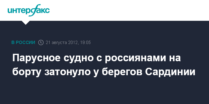 Рим. 21 августа. INTERFAX.RU - Итальянская береговая охрана пришла на помощь близ острова Сардиния восьмерым любителям парусного спорта из России и Австрии, чье судно пошло ко дну, сообщают во вторник римские СМИ.