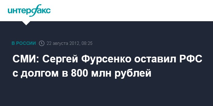 Москва. 22 августа. INTERFAX.RU - Экс-глава Российского футбольного союза (РФС) Сергей Фурсенко ушел в отставку, оставив организацию с многомиллионными долгами, большая часть которых составляет непогашенный кредит банку "Россия", пишут "Ведомости" в среду.
