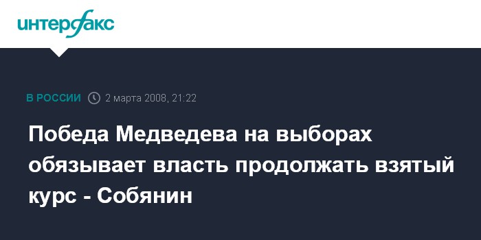"Дмитрий Медведев набирает уверенно те голоса, которые нужны для победы, и это результат не только и не столько выборной кампании, сколько результат того социально-экономического положения, которое достигнуто в стране за последние годы. Это результат того политического тандема, который составили Медведев и Путин. И это обязывает власть продолжать взятый курс", - заявил С.Собянин в эфире Первого телеканала.