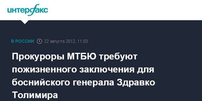 Гаага. 22 августа. INTERFAX.RU - Прокуроры ООН потребовали приговорить к пожизненному заключению бывшего боснийского генерала Здравко Толимиру, обвиняемому в военных преступлениях.
