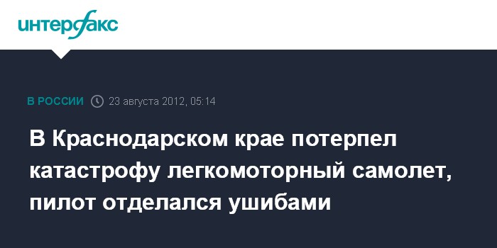 "Летное происшествие произошло в среду близ станицы Староминская (Краснодарский край). Легкомоторный самолет СП-34 при взлете для проведения сельхозработ рухнул на землю и получил сильные механические повреждения. Пилот отделался ушибами", - сказал собеседник агентства.