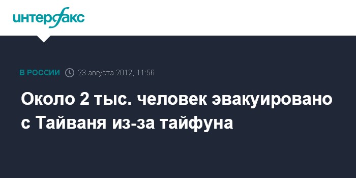 Пекин. 23 августа. INTERFAX.RU - Власти Тайваня распорядились эвакуировать около 2 тыс. жителей острова в связи с приближением тайфуна "Тембин", сообщают в четверг местные СМИ.