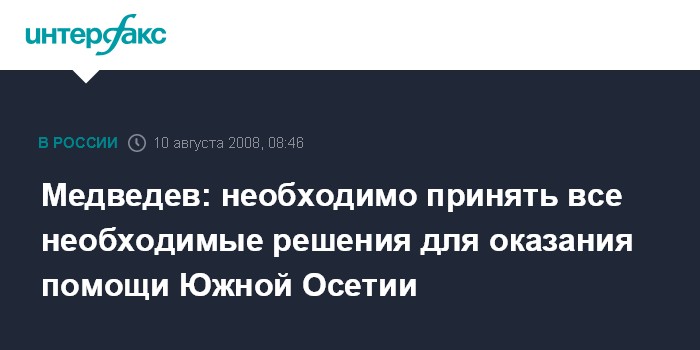 Москва. 10 августа. INTERFAX.RU - Президент России Дмитрий Медведев заявил на встрече с премьер-министром Владимиром Путиным, что должны быть приняты все необходимые для помощи Южной Осетии решения.