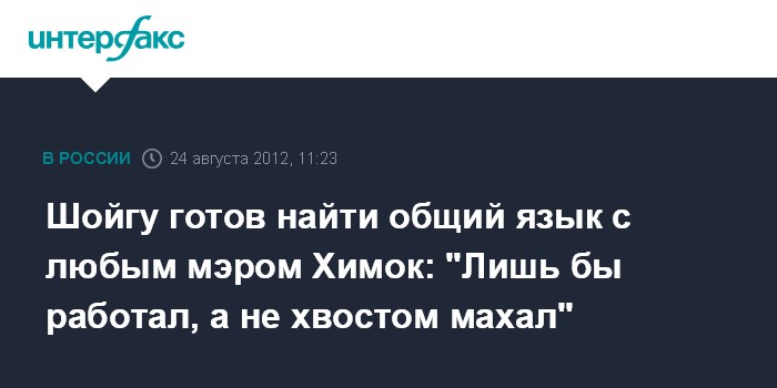"Сработаемся с любым, кого выберут люди, даже если люди выберут циркового коня, лишь бы он работал, а не просто хвостом махал", - заявил Шойгу в интервью газете "Коммерсант", отвечая на вопрос, сработается ли он с новым мэром Химок, если выборы выиграет Е.Чирикова.