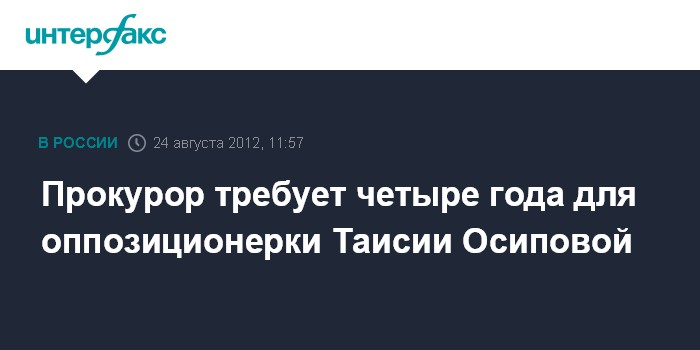 Москва. 24 августа. INTERFAX.RU - Гособвинитель попросил приговорить активистку движения "Другая Россия" Таисию Осипову, которая обвиняется в незаконном обороте наркотиков, к четырем годам лишения свободы.