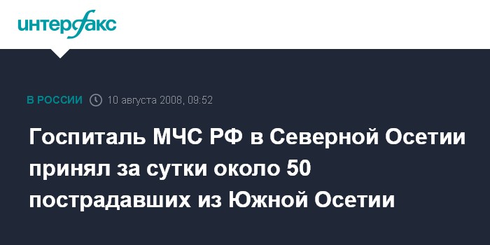 Москва. 10 августа. INTERFAX.RU - С 12:00 мск субботы до 9:00 воскресенья через аэромобильный госпиталь МЧС России, развернутый в Северной Осетии, прошло 47 пострадавших, эвакуированных из зоны боевых действий грузино-югоосетинского конфликта.