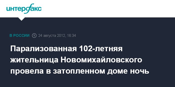 Краснодар. 24 августа. INTERFAX.RU - 102-летняя жительница поселка Новомихайловский Мария Носова и ее дочь, заблокированные во время наводнения водой на всю ночь в своем доме, дождались утром помощи и были эвакуированы к родственникам.