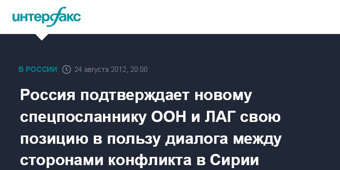 Москва. 24 августа. INTERFAX.RU - Глава МИД России Сергей Лавров подтвердил новому спмецпредставителю ООН и ЛАГ по Сирии Лахдару Брахими, что Москва выступает за начало политического диалога между сторонами внутрисирийского конфликта.