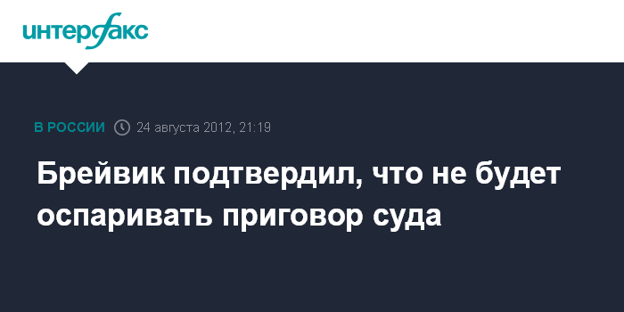 Осло. 24 августа. INTERFAX.RU - Норвежский террорист Андерс Брейвик заявил в пятницу, что не собирается оспаривать решение суда приговорившего его к 21 году тюрьмы. "Я не собираюсь подавать апелляцию", - сказал он в зале суда.