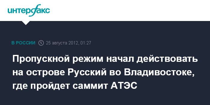 Владивосток. 25 августа. ИНТЕРФАКС - ДАЛЬНИЙ ВОСТОК - Жители острова Русский во Владивостоке, где в сентябре пройдет саммит АТЭС-2012, начиная с субботы, смогут попасть домой только по пропускам.