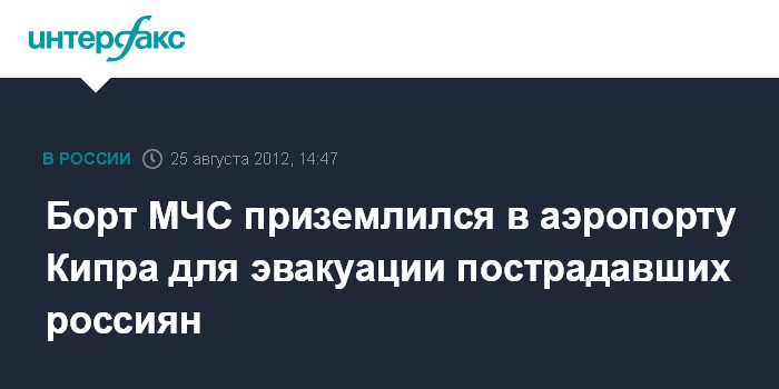 Ларнака. 25 августа. INTERFAX.RU - Спецрейс МЧС России прибыл в Республику Кипр для эвакуации россиян, пострадавших во время отдыха на Кипре. Как передает корреспондент "Интерфакса", в 14:30 мск самолет Ил-76 МЧС России совершил посадку в аэропорту Ларнаки. Планируется, что с Кипра спецрейсом в Москву будет доставлено четыре человека, в том числе 14-летняя девочка, пострадавшая в результате ДТП.