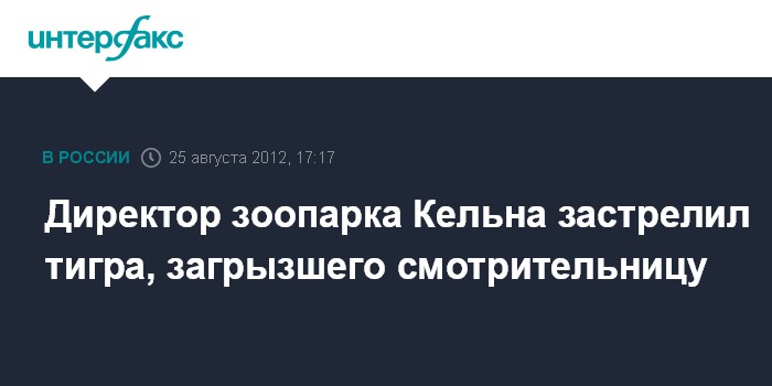 Лондон. 25 августа. INTERFAX.RU - Смотрительницу в зоопарке немецкого города Кельн загрыз насмерть тигр, вырвавшийся из клетки, сообщает в субботу британская телерадиокорпорация Би-Би-Си. По ее данным, директор зоопарка был вынужден застрелить животное. По словам полицейских, трагедия произошла из-за невнимательности: скорее всего, клетку с хищником плохо закрыли.
