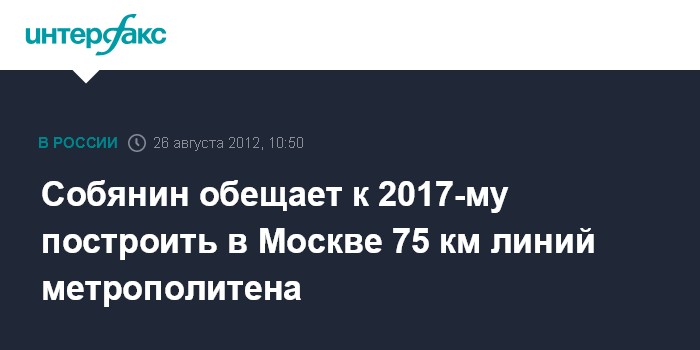 Москва. 26 августа. INTERFAX.RU - Столичные строители в 2012 году введут в эксплуатацию 8,5 км линий метрополитена, сообщил мэр Москвы Сергей Собянин в интервью каналу "Россия-1" в воскресенье. Он пообещал, что в 2013 году в Москве появится 14 км новых линий, в 2014 - 18 км, в 2015 - 30 км. "За пять лет мы построим 75 км", - уточнил градоначальник.