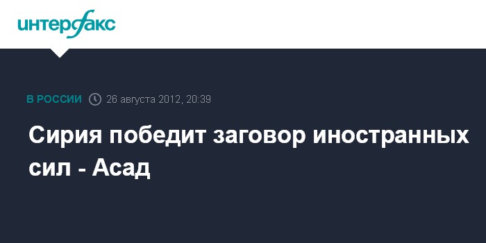 Бейрут. 26 августа. ИНТЕРФАКС - Президент Башар Асад заявил о решимости противостоять заговору иностранных сил, направленному, по его словам, против Сирии.
