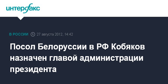 Минск. 27 августа. INTERFAX.RU - Президент Белоруссии Александр Лукашенко назначил Андрея Кобякова главой своей администрации, сообщили агентству "Интерфакс-Запад" в пресс-службе президента Беларуси.