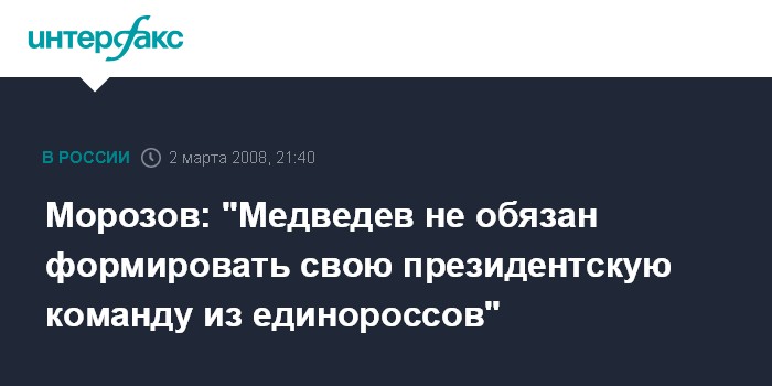 Москва. 2 марта. INTERFAX.RU - Первый вице-спикер Госдумы, один из руководителей "Единой России" Олег Морозов считает, что Дмитрий Медведев на посту президента не должен формировать команду из числа "единороссов".