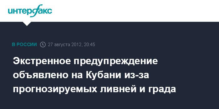Экстренное предупреждение объявлено на Кубани из-за прогнозируемых ливней и града