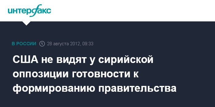 Вашингтон. 28 августа. INTERFAX.RU - Соединенные Штаты пока не наблюдают готовности сирийской оппозиции к формированию временного или переходного правительства, но продолжают работу в этом направлении, заявила в понедельник на брифинге официальный представитель госдепартамента США Виктория Нуланд.