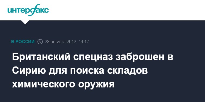Вашингтон/Лондон. 28 августа. INTERFAX.RU - Отряды британского спецназа заброшены на территорию Сирии для установления точного местонахождения складов химического и биологического оружия и их возможной ликвидации, сообщили западные СМИ, ссылаясь на информированные военные источники.