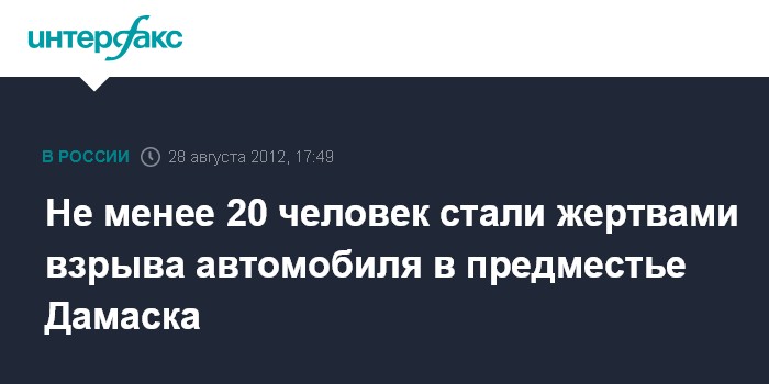 Бейрут. 28 августа. INTERFAX.RU - По меньшей мере, 20 человек погибли в результате взрыва начиненного взрывчаткой автомобиля на похоронах в Джарамане - предместье столицы Сирии Дамаска, передает во вторник сирийское государственное телевидение.