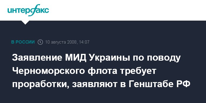 Москва. 10 августа. INTERFAX.RU - Заявление украинского МИДа о том, что кораблям Черноморского флота РФ, которые примут участие в операции по блокаде Грузии, будет запрещено вернуться на базу, требует проработки, считает замначальника Генштаба Вооруженных сил РФ генерал-полковник Анатолий Ноговицын