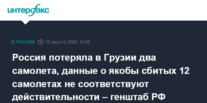 Москва. 10 августа. INTERFAX.RU - Генеральный штаб Вооруженных сил России опроверг сообщения грузинской стороны о 12 сбитых российских самолетах.