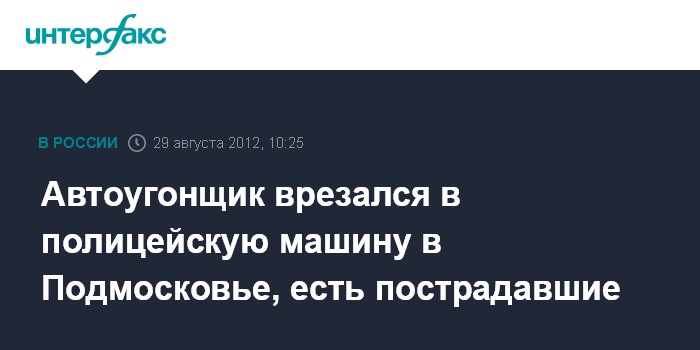 Москва. 29 августа. INTERFAX.RU - Два полицейских пострадали в ДТП в Московской области, которое устроил водитель на угнанных "Жигулях", сообщил в среду "Интерфаксу" источник в правоохранительных органах.