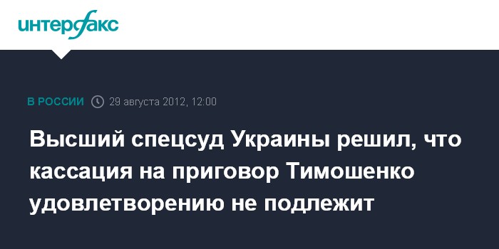 Киев. 29 августа. INTERFAX.RU - Высший специализированный суд Украины по рассмотрению гражданских и уголовных дел считает, что кассационная жалоба защиты экс-премьера Украины Юлии Тимошенко на приговор по "газовому делу" удовлетворению не подлежит.