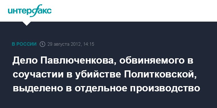 Москва. 29 августа. INTERFAX.RU - Расследование уголовного дела в отношении бывшего сотрудника ГУВД Москвы Дмитрия Павлюченкова, который обвиняется в соучастии в убийстве журналистки "Новой газеты" Анны Политковской, выделено в отдельное производство.
