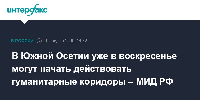 Москва. 10 августа. INTERFAX.RU - Гуманитарные коридоры для вывода мирного населения и раненых из зоны боевых действий в Южной Осетии могут быть открыты уже в воскресенье, сообщил замглавы МИД РФ Григорий Карасин.