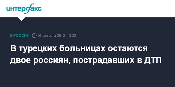 Москва. 30 августа. INTERFAX.RU - По состоянию на середину дня четверга в больницах Турции остаются двое россиян, пострадавших накануне в ДТП в Анталии, - женщина с переломом левой ключицы и мужчина с ушибом головы, сообщает Ростуризм со ссылкой на данные генконсульства РФ в Анталии.